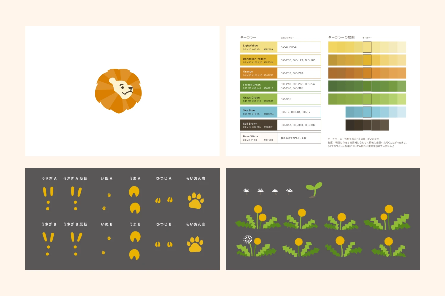 らいおん先生のいる野原を体現するために、色彩計画を策定しました。草色・たんぽぽ色・空色を中心とした色彩を設定し、イラストのアセットも用意。このルールを関係者に共有し、クリエイティブの方向性を統一しました。イラストは、院内のあちこちに散りばめられています。