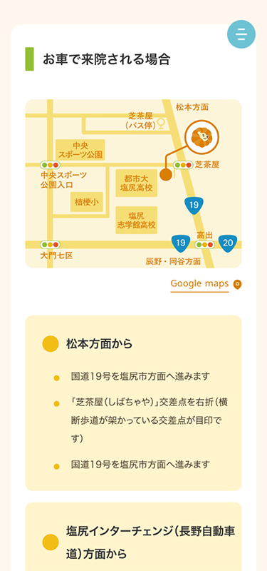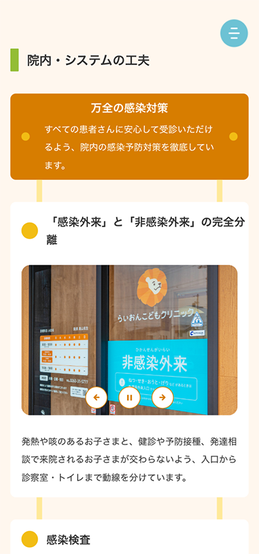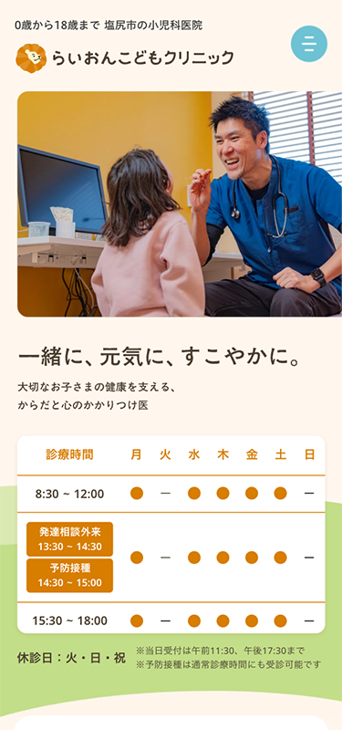 親御さまの不安に寄り添うことを第一に、「この病院なら、大丈夫」と感じてもらえる情報設計・デザインを行いました。初めての方でも安心して来院できるよう、メインビジュアルには先生が診察中のカットを使用。診療時間表もすぐに表示させ、情緒的にも機能的にも、知りたい情報がすぐ目に入る設計にしています。