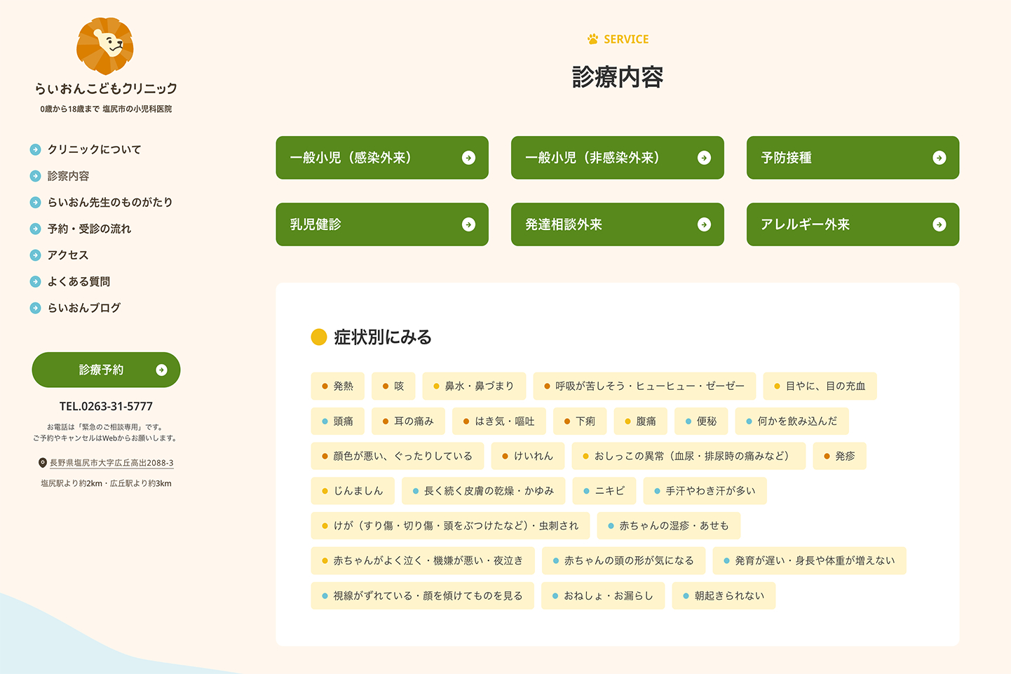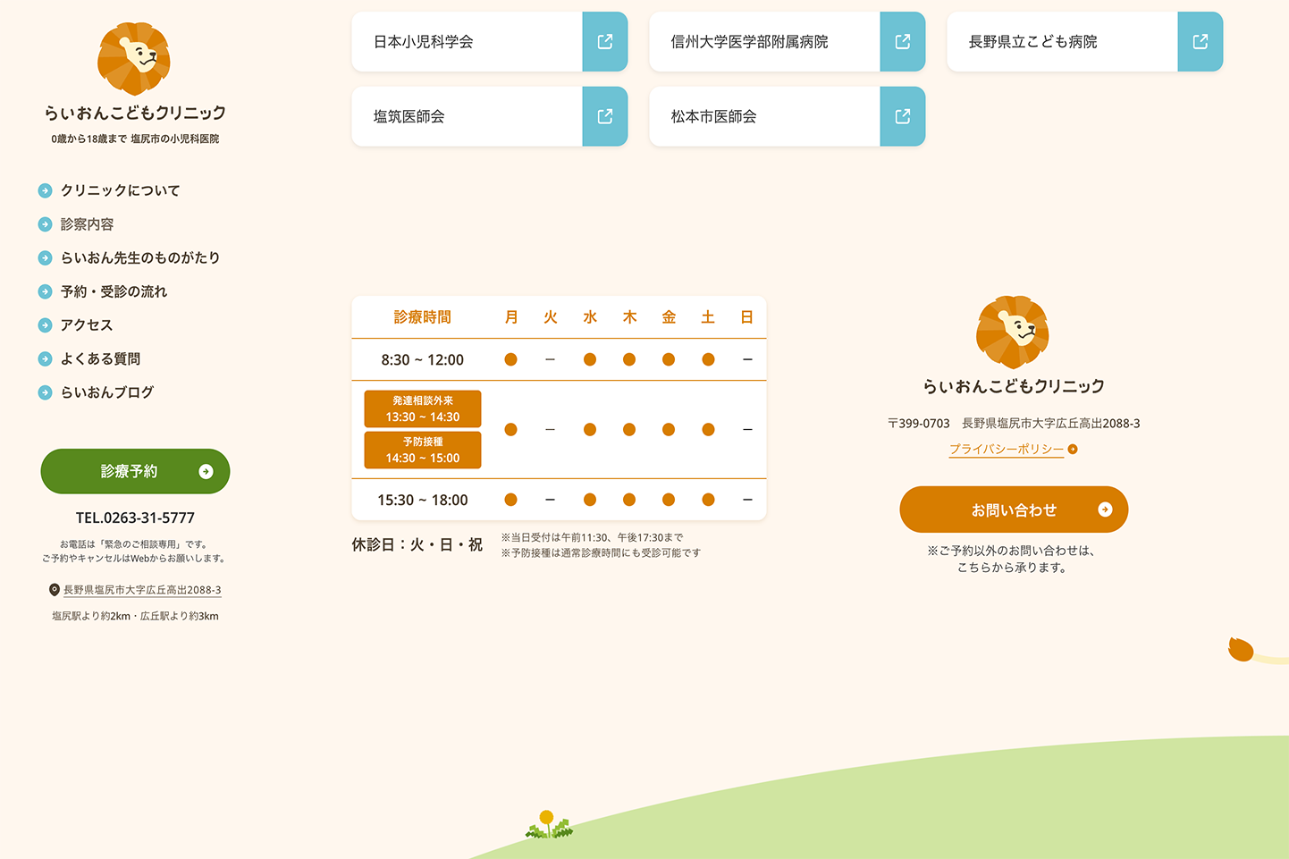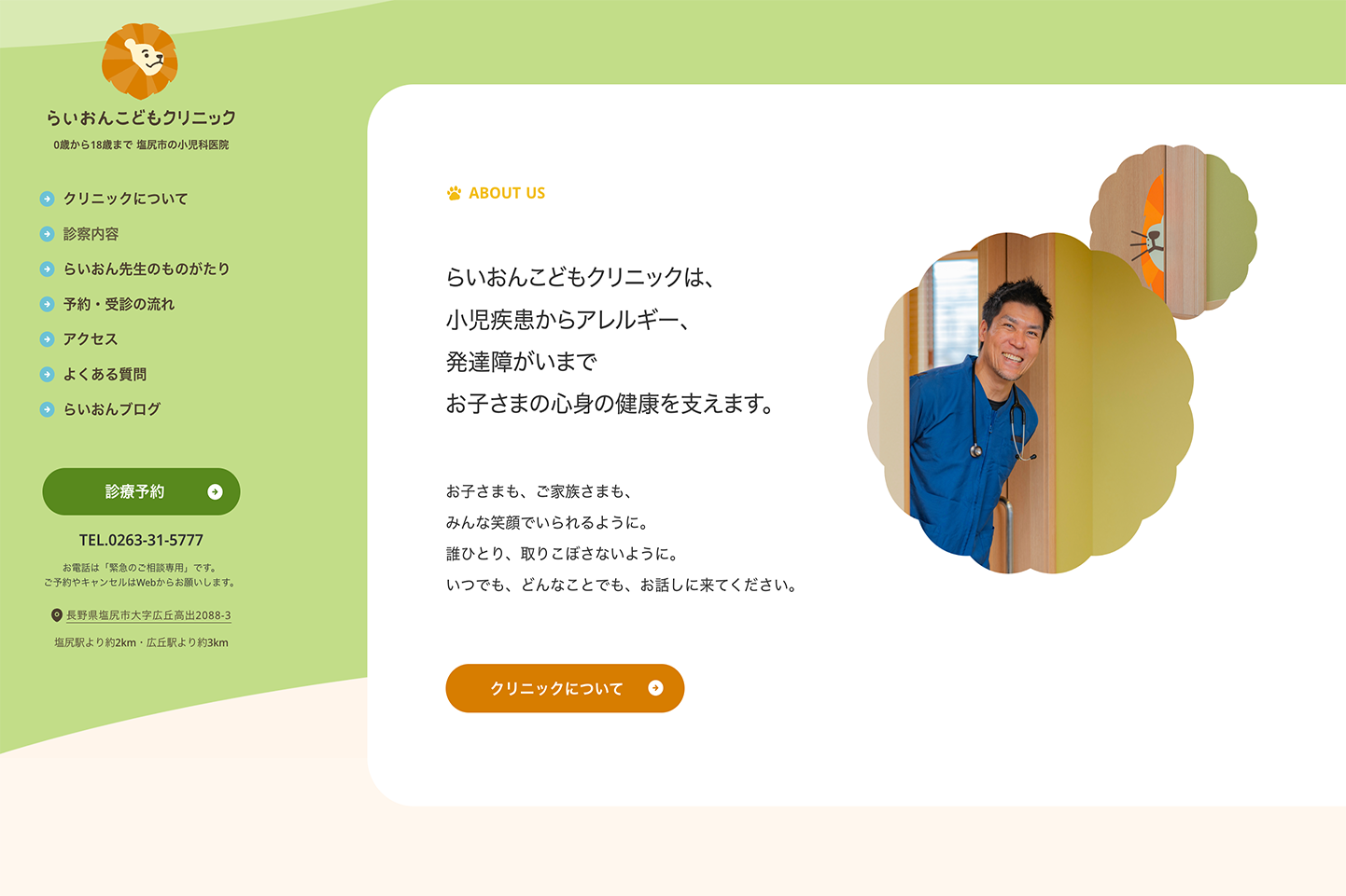 長野県塩尻市に開業した、らいおんこどもクリニック様のブランディングを行いました。ブランドコンセプト、ブランドストーリー、キャッチコピー、ロゴ、色彩計画、サイン、名刺、Webサイトと、トータルでクリエイティブをご支援しています。