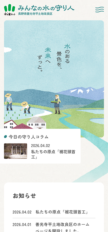 水路・田んぼ・空・草花といった善光寺平の自然を連想させるビジュアルを基調に、親しみやすさと信頼感を両立したデザインに仕上げました。ひらけた景色から水が流れ、未来へと続いていく様子を、トップからフッターまで一貫して表現しています。